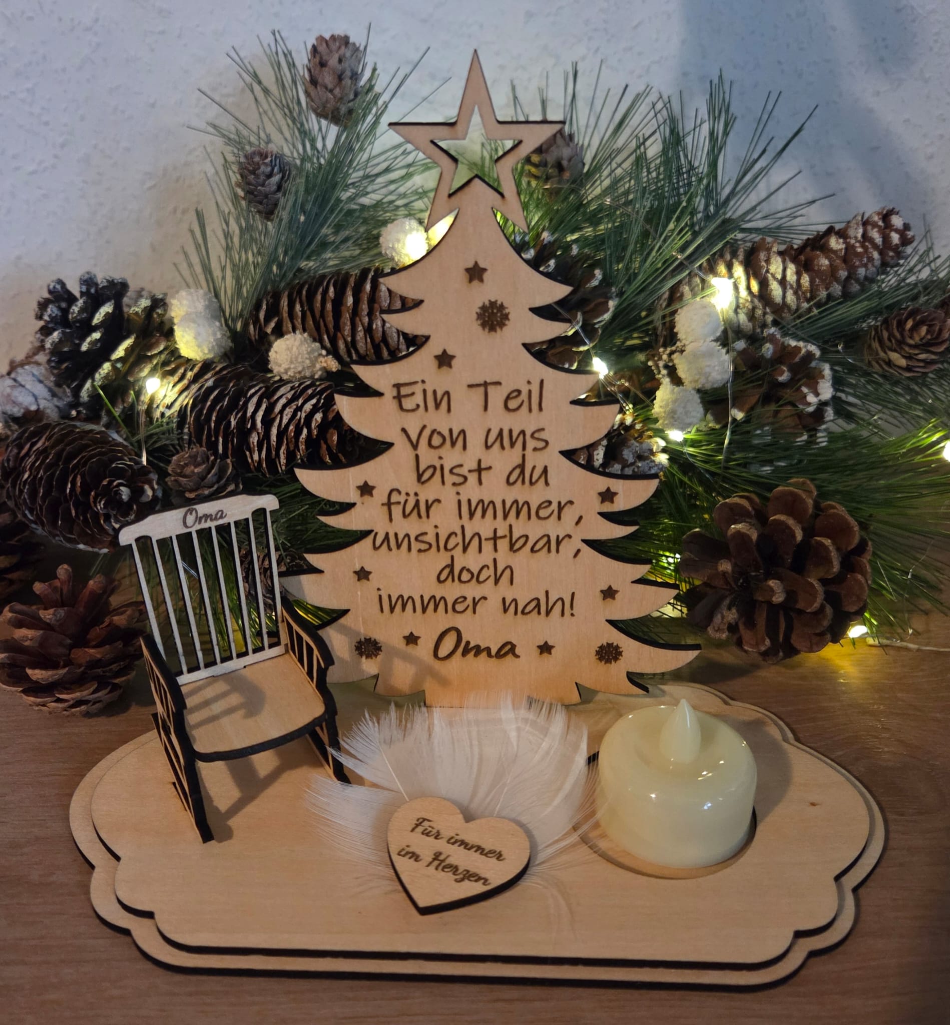 Der gravierte Baum trägt deine persönliche Botschaft – z. B. „Ein Teil von uns bist du für immer, unsichtbar, doch immer nah!“ – und kann mit einem Namen oder einem kurzen Text individualisiert werden.